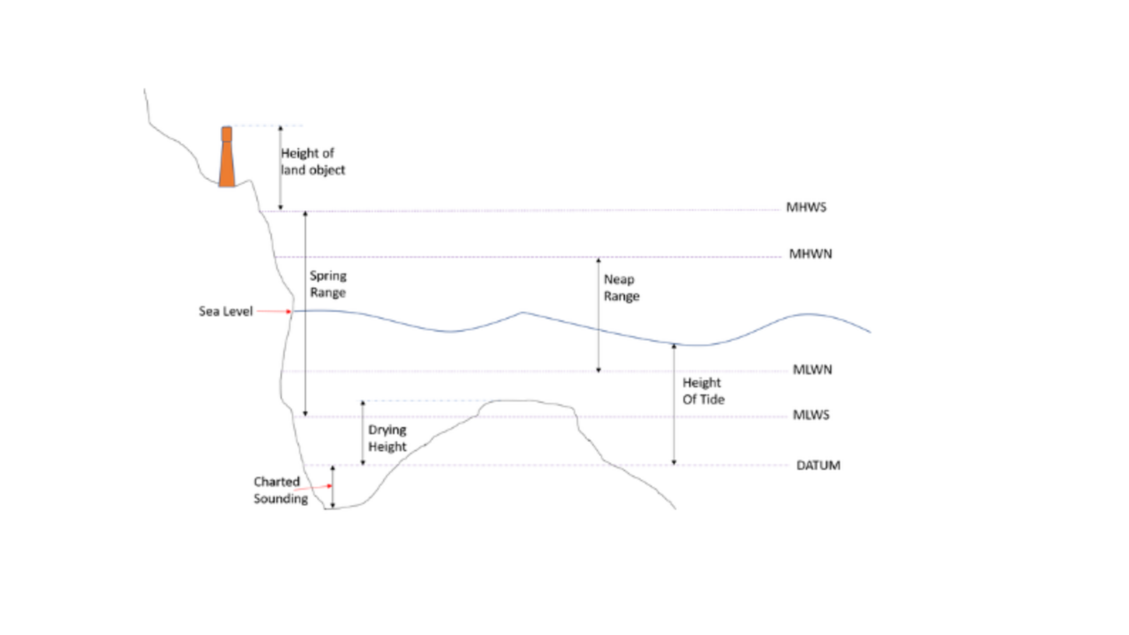 Depths: reduced to Chart Datum, which means they use the datum of the Lowest Astronomical Tide (LAT). The Lowest Astronomical Tide is the lowest levels which can be predicted to occur under average meteorological conditions.