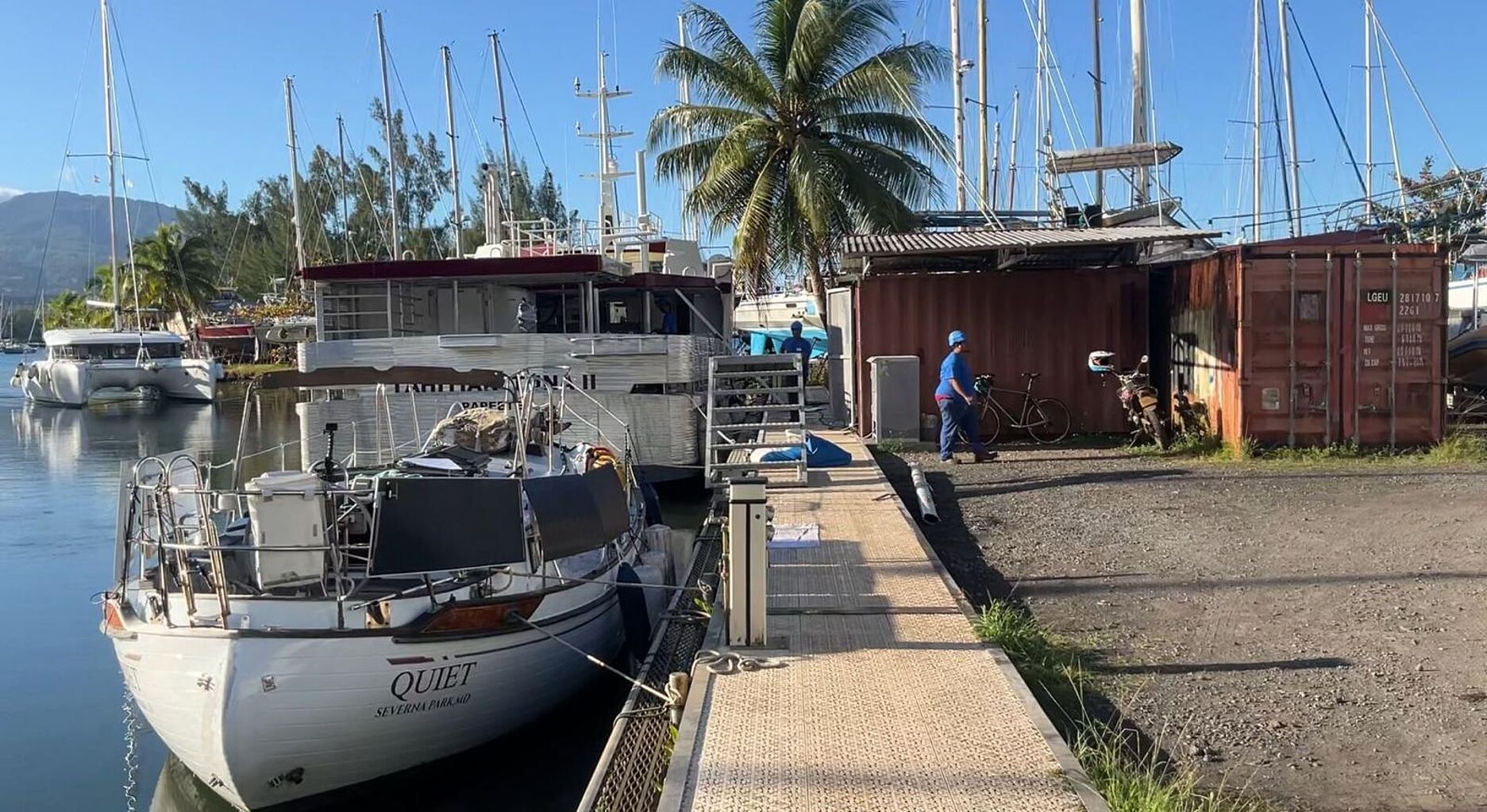 Als ich den Franzosen Olivier Greduvan treffe, der bei Vincent in der Werft darauf wartet, auf seinem 43 Fuß-Kat „Pleiade“ endlich wieder den Mast zu stellen und weiter segeln zu können, erfasse ich das ganze Ausmaß. Fast ein Jahr pausiert er nach seinem Mastbruch bereits. Dabei hatte er seinen Mast sogar retten können und brauchte „nur“ neue Warten, Stagen, Beschläge etc.