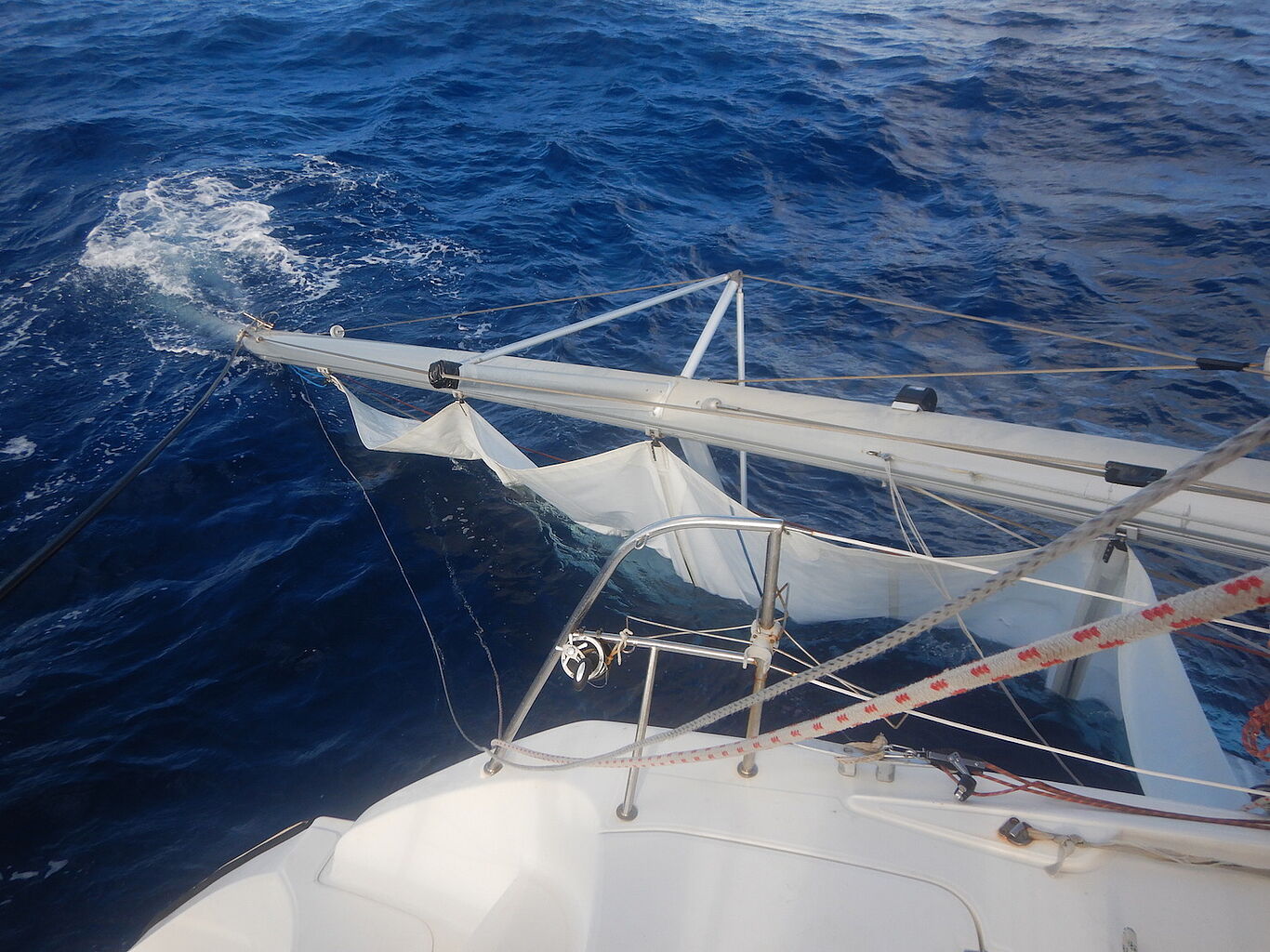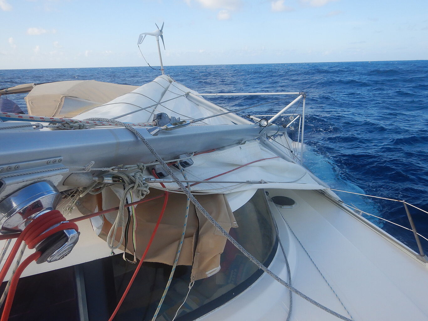 „Ich habe etwa 2 Tage gebraucht, die Drähte zu kappen und das Chaos zu beseitigen. Dann bin ich mit Hilfe eines Wetter-Routers zwei Tage lang in eine ruhigere Zone motort um ein Jury Rigg aufzubauen. Nach einer guten Woche harter Arbeit konnte ich wieder ein kleines Segel setzen.
